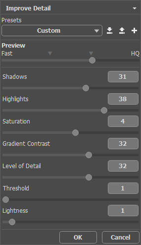 Adjust the settings to make muted colors more intensive and vivid and enhance image detail. Use the Preview option to preview the processing output. When you select the Fast mode, the calculation is fast based on the thumbnail image. When selecting HQ, the image takes longer to process in its original size.