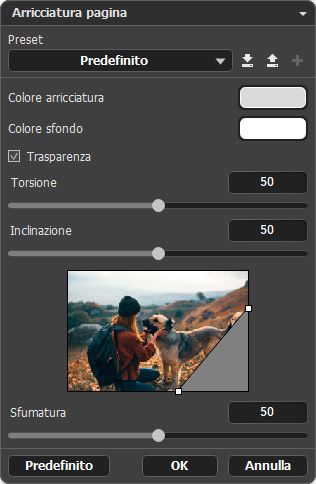 Trasparenza. Quando la casella di controllo è selezionata, l’area sotto l’arricciatura, che viene scoperta, diventa trasparente e si può utilizzare su un'immagine con più livelli. In questo modo, l'immagine sul livello inferiore è visibile sotto la pagina arrotolata.